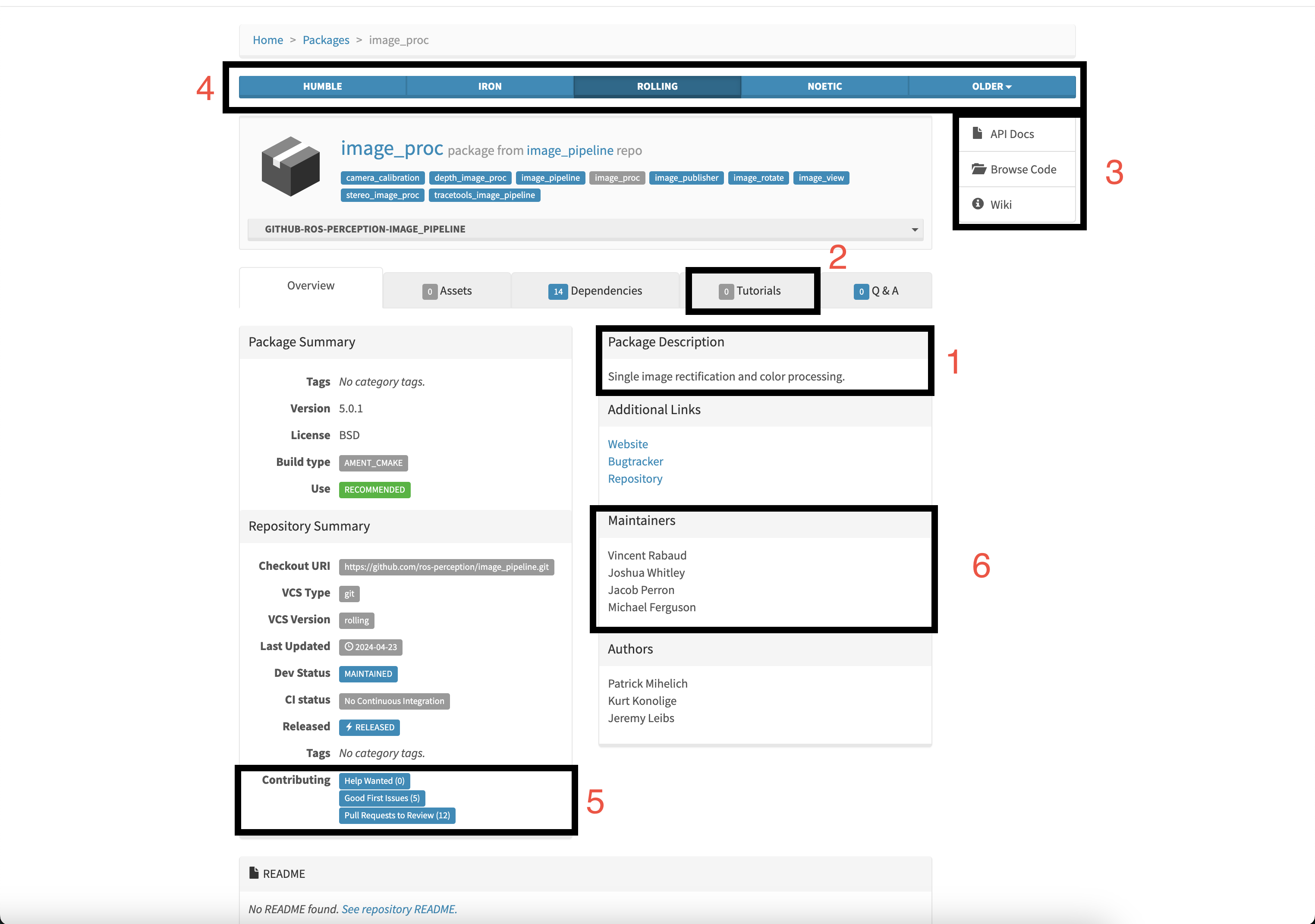 Package DescriptionThe general description of the package, this should be similar to what was searched if it wasn’t an exact package name.TutorialsIf there are any tutorials available in the documentation they will show up here. Those looking to get started with a package should look here as the tutorials will often be up to date and well maintained by those who use the package often.DocumentationThe original documentation for the ROS package and the repository where source code and documentation can be found.DistributionROS 2 has various distributions which may have differences in design. Click on the ROS distribution (version) that matches the ROS version installed on your system.ContributingThis software is open source, so it needs the community’s help to actively be maintained. One should utilize this section if they wish to help solve issues, review pull requests, or are looking to see if an active fix is being deployed for a problem they encountered.MaintainersThis tab lists the community members who are actively responsible for the development of the package. While the maintainers have a vast amount of information one should use the Robotics Stack Exchange https://robotics.stackexchange.com/search?q= with the [tag] of the package, if they want questions answered.