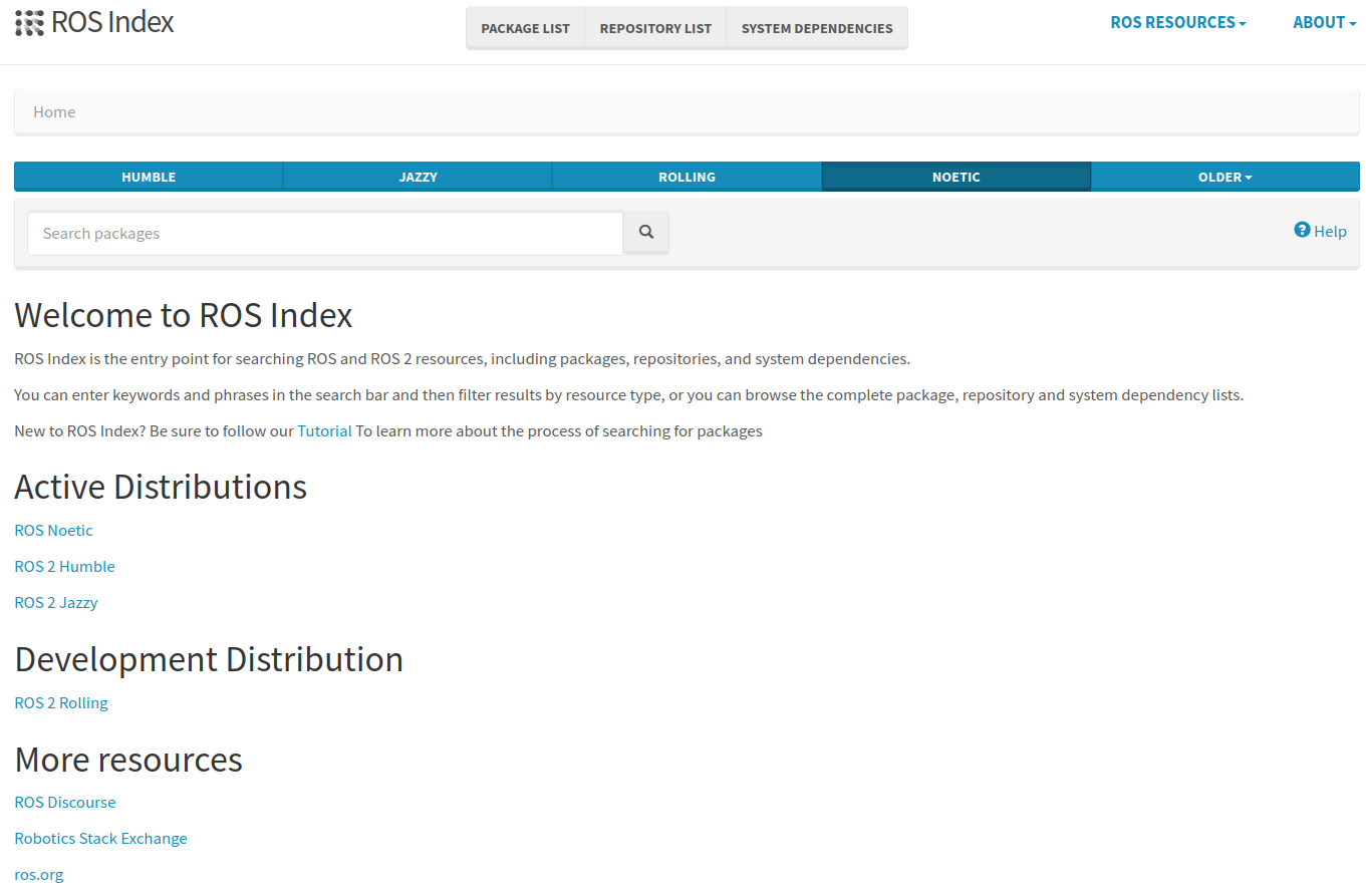 Package searches and lists are shown for specific ROS distributions. Click on the appropriate distribution name to select your desired ROS distribution.